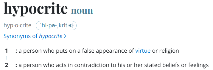 Lets look at the definition of the word hypocrite, according to Merriam-Webster