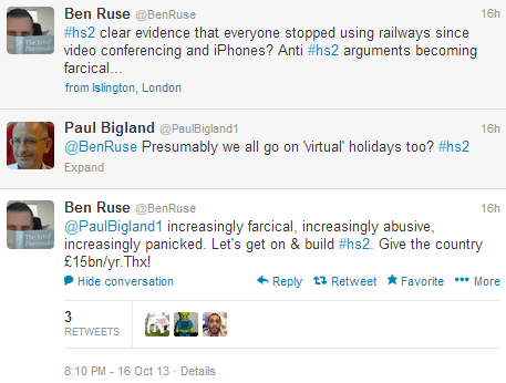 After being suspended from Twitter, did Paul re-think his ways? No, of course not! Paul simply switched to his business account on Twitter to continue what is arguably a non-stop campaign of abuse and vitriol against HS2 opponents.